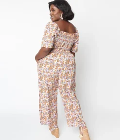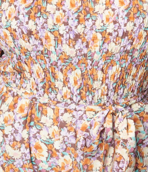 This adorable 1970’s inspired jumpsuit is crafted in a brown woven and boasts lovely orange, purple and ivory florals throughout. Outfitted with a smocked bodice and short sleeves with elastic shoulders. Complete with side pockets and a self-tie sash to cinch the waist.