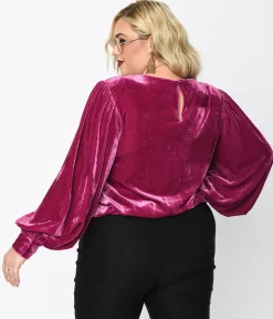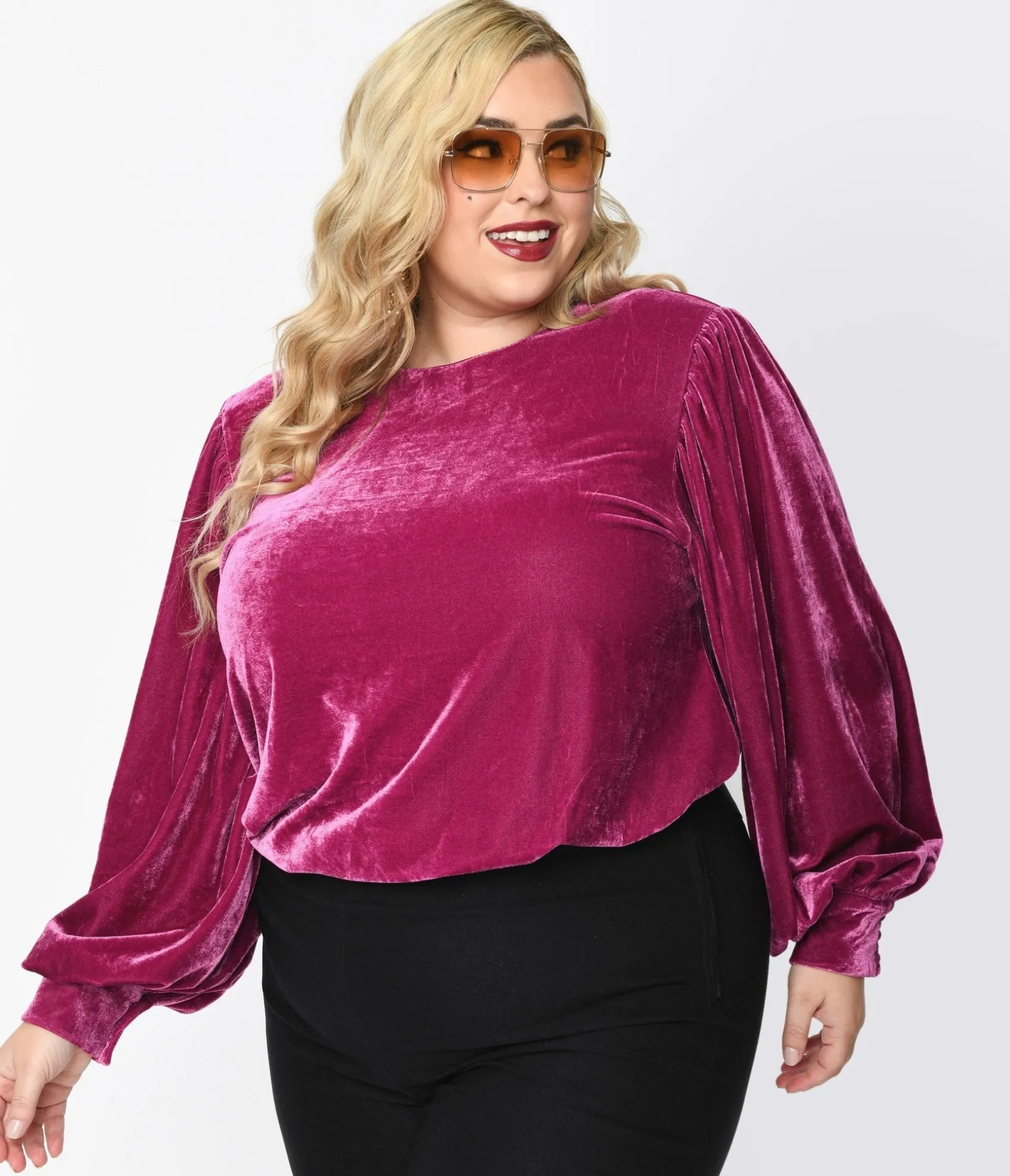 This dazzling top is crafted in a stunning purple velvet and boasts a scoop neck, long sleeves, and an elastic waistband.