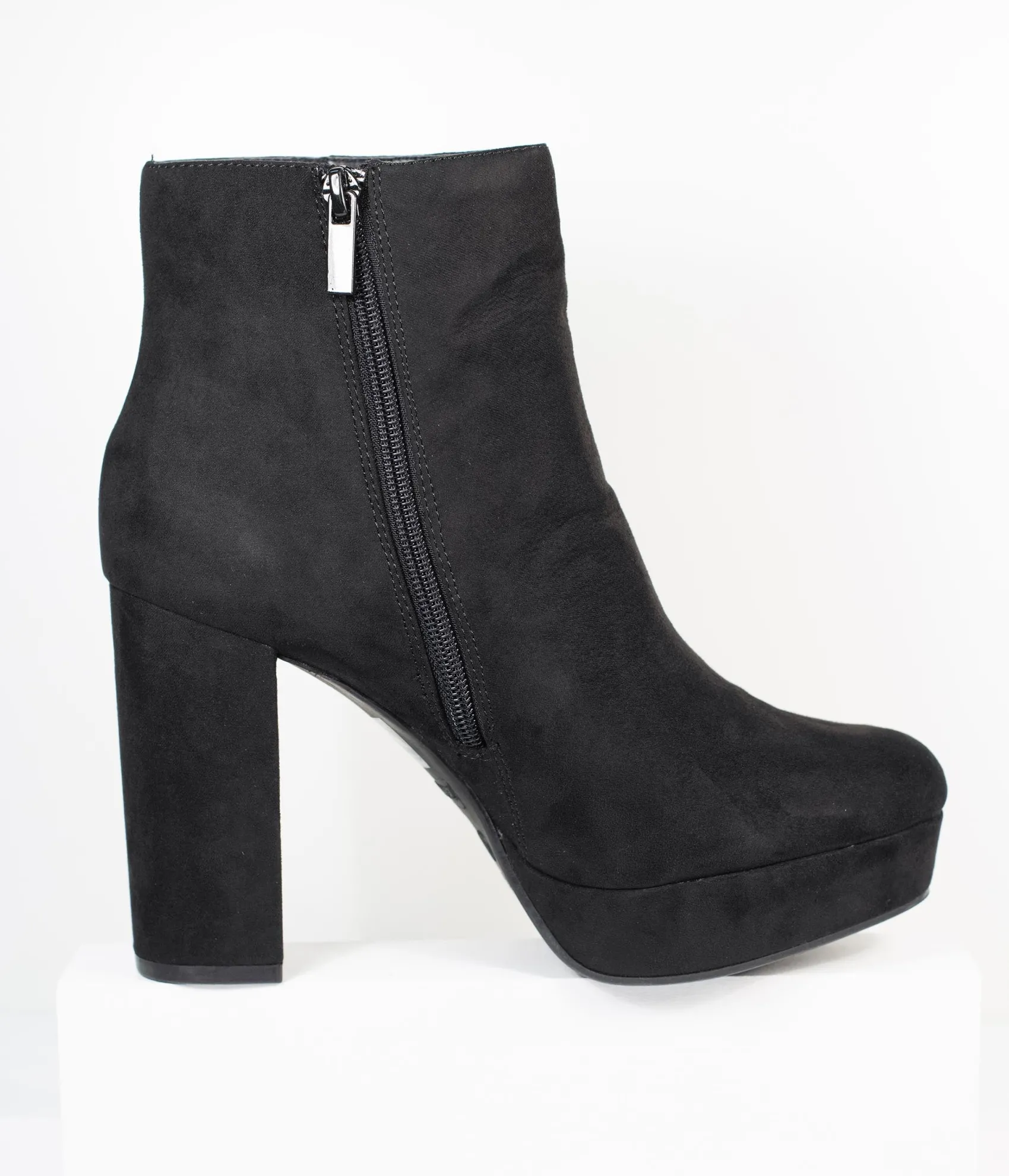 Putting on airs, dames! These fabulous black booties are crafted in a sensational faux suede for a divine addition to your swagger. A side zipper secures these kicks while the 4.5 inch block heel and 1 inch platform keep you high and mighty. Complete with a cushion insole for all day struts!