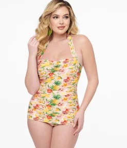 This classic light pink swimsuit features a fun and vibrant fruit print throughout, giving you that retro-inspired look for your next beach day. The sewn-in padded cups provide extra support and shape, while the pleated skirt adds a touch of femininity to your swimwear ensemble. With halter tie straps for adjustable comfort, this swimsuit is perfect for lounging by the pool or taking a dip in the ocean.