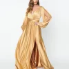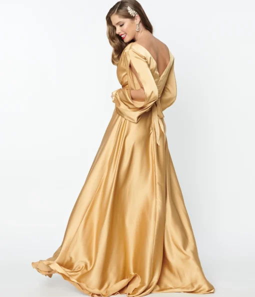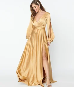 Styled with gathered ruching on a faux wrap style bodice, this gorgeous gold liquid satin dress fashions a split long bishop sleeves and V-neckline mirrored with V-back. It has a back zipper closure and the natural waist is accented with a waistband and tie. A side slit accents the skirt and it gracefully flares to a full length A-line silhouette.