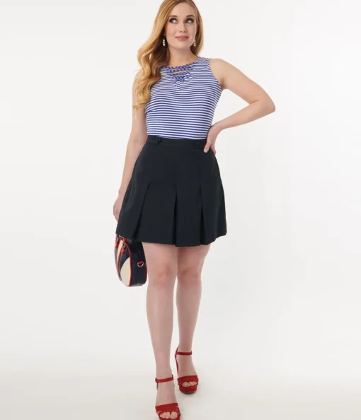 This darling pair of 1950s style shorts is crafted in a navy woven fabric and boasts a pleated design, faux button front, and side pockets.