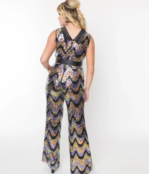 This groovy 1960’s style jumpsuit from Smak Parlour is crafted in a knit blend and dazzles with multicolor sequins in a zig zag pattern. Outfitted with a black satin cowl neckline, back zipper and matching black satin self-tie sash to cinch your waist. Complete with side pockets.
