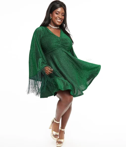 Smak Parlour Plus Size 1970s Green Sparkle & Fringe Bell Sleeves Dress