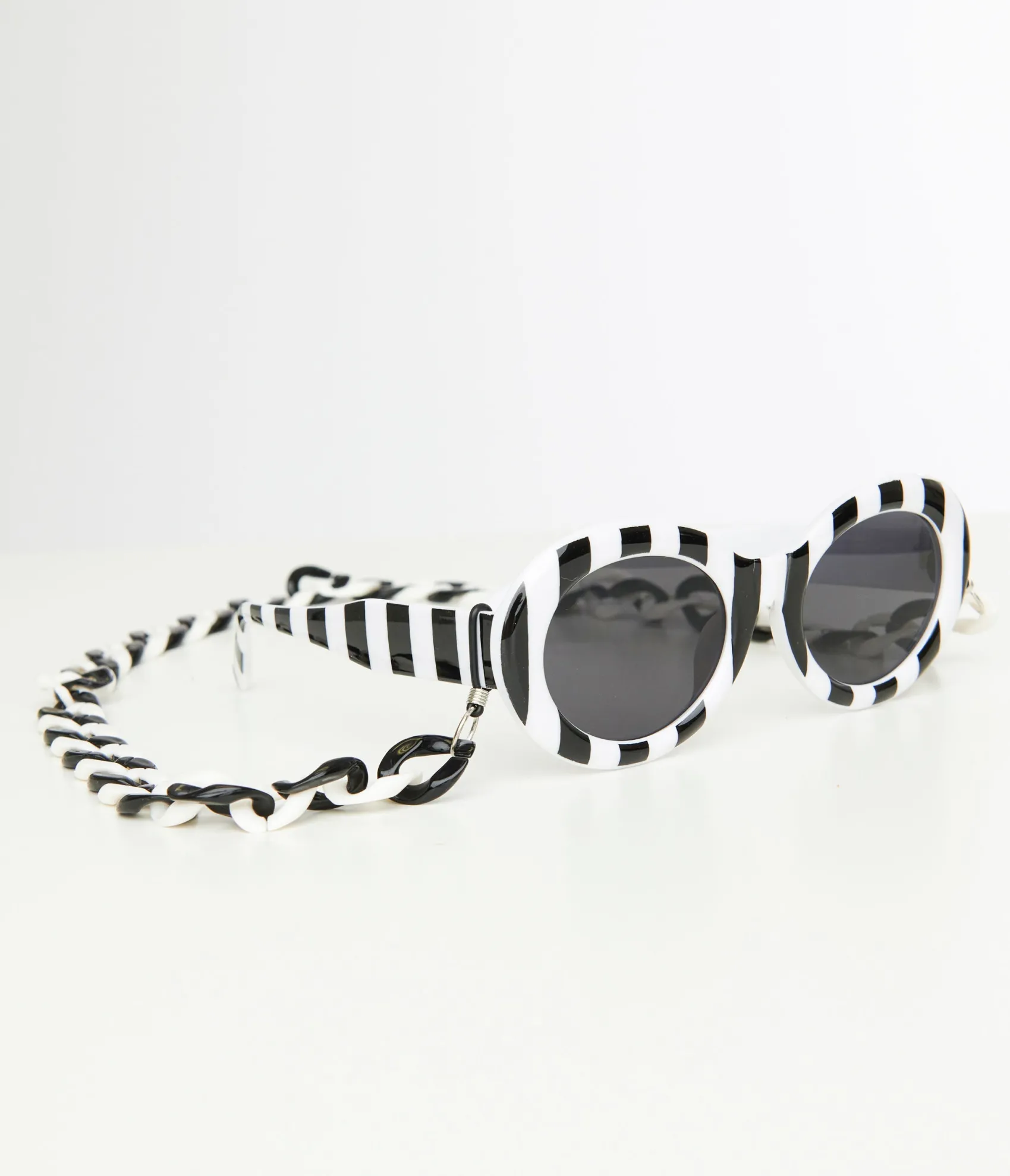 The unique oval shape and bold stripes add a fun twist to your outfit. Plus, the removable black & white neck chain keeps them secure around your neck when you’re not wearing them. Complete with sleek black tinted lenses.