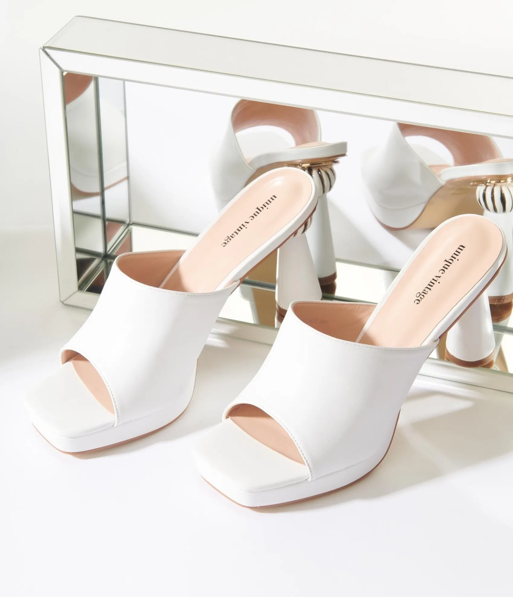 Be the first to review “Unique Vintage White Leatherette Spiral Ball Mule Heels” Cancel reply